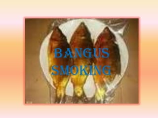 The document discusses the smoking process for bangus fish. Smoking involves exposing fish to wood smoke until it turns golden brown, as the chemicals in smoke help destroy bacteria. The key steps are weighing, washing, brining, brine cooking, smoking, cooling, and packing the fish using equipment like a smoke house, smoking trays, basins, and food tongs. Various citrus and guava leaves can be used to produce the smoke.