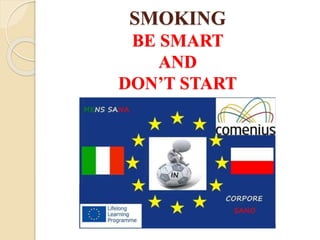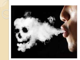 This document discusses the harmful chemicals found in cigarettes and the health risks of smoking. It lists several toxic and carcinogenic chemicals such as nicotine, benzopyrene, arsenic, cadmium, polonium, hydrogen cyanide, carbon monoxide, and methanol. These chemicals are linked to cancer, poisoning, and other serious health issues. The document emphasizes that smoking exposes people not only to the risks of addiction, but also to the dangerous effects of inhaling these chemicals. It encourages readers to consider the risks and make the right choice to not start smoking.