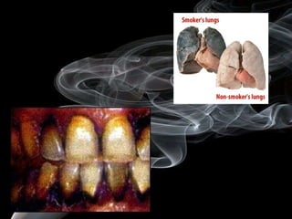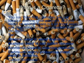 The document discusses the negative health effects of smoking cigarettes. It notes that cigarettes contain over 4,000 ingredients including arsenic, acetone, ammonia, cadmium, formaldehyde, and carbon monoxide. Smoking increases the risks of various cancers, heart disease, teeth discoloration, and respiratory illnesses. It also outlines the financial costs of smoking and some of the health benefits within 72 hours to 15 years of quitting such as improved lung function and reduced cancer and heart disease risks.