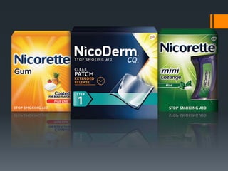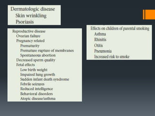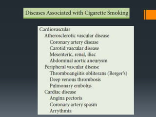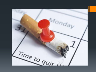 This document discusses the history and health effects of smoking. It begins by outlining the origins of tobacco use among Native Americans and its spread to Europe. It then details the addictive properties of nicotine and how cigarettes effectively deliver nicotine to the brain. The document covers the social and cultural role of smoking as well as initiatives to reduce it. Finally, it outlines strategies for smoking cessation and the health benefits of quitting, including reduced risk of lung cancer, heart disease and improved lung function.