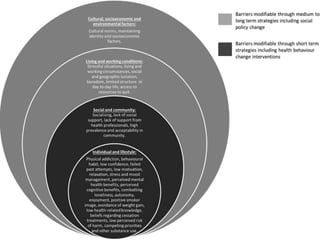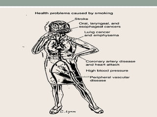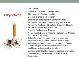 This document provides an overview of smoking cessation. It begins with an introduction discussing the negative health impacts of smoking and statistics on smoking rates. It then covers the chemical components in cigarettes and negative effects of smoking on various parts of the body. Benefits of smoking cessation are outlined. The document also summarizes several research studies on smoking cessation methods and their effectiveness, including enhanced motivational interviewing versus brief advice, nicotine replacement therapy, and a randomized trial of nicotine replacement therapy patches in pregnancy. Barriers to smoking cessation and electronic cigarettes are also discussed.