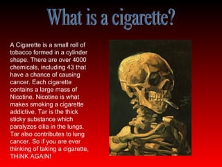 Smoking cigarettes can seriously harm your health in several ways. It increases the risks of various cancers like lung cancer and heart disease, which are among the leading causes of death in the UK. Over 100,000 people die each year from smoking-related illnesses. Smoking also reduces life expectancy by about 10 years on average compared to non-smokers. The chemicals in cigarettes are addictive and can damage the lungs and blood vessels long-term in ways that lead to chronic illnesses and early death.