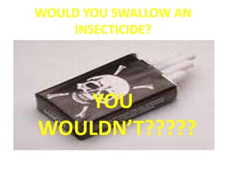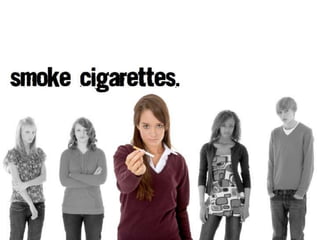 This document discusses the dangers of teenage smoking. It notes that 1/3 of smokers begin by age 14, 90% by age 21, and over 6 million child smokers are predicted to die prematurely from smoking. Reasons teenagers start include psychological factors like depression and social factors like peer pressure. Short term effects include bad breath and long term effects include cancer, heart disease, and premature death. The document lists the many toxic chemicals found in cigarettes and costs over $12,000 to smoke for 5 years. It encourages quitting now for health and financial benefits.