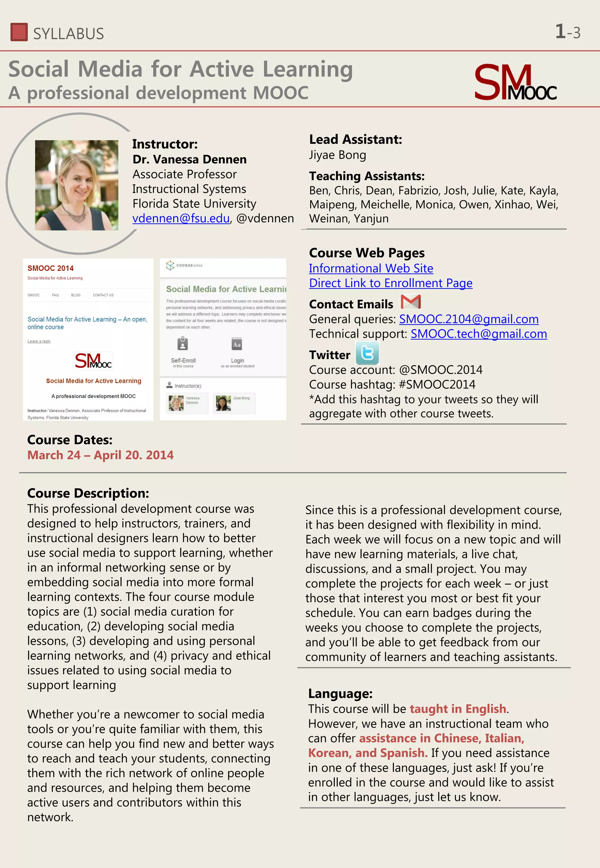 The document outlines a professional development MOOC titled 'Social Media for Active Learning,' instructed by Dr. Vanessa Dennen, running from March 24 to April 20, 2014. It consists of four modules focusing on social media curation, lesson development, personal learning networks, and privacy/ethics, with opportunities for participant engagement and earning badges for completing projects. Flexibility is emphasized, allowing participants to choose projects that align with their interests, and the course includes live webinars and discussions for enhanced learning.