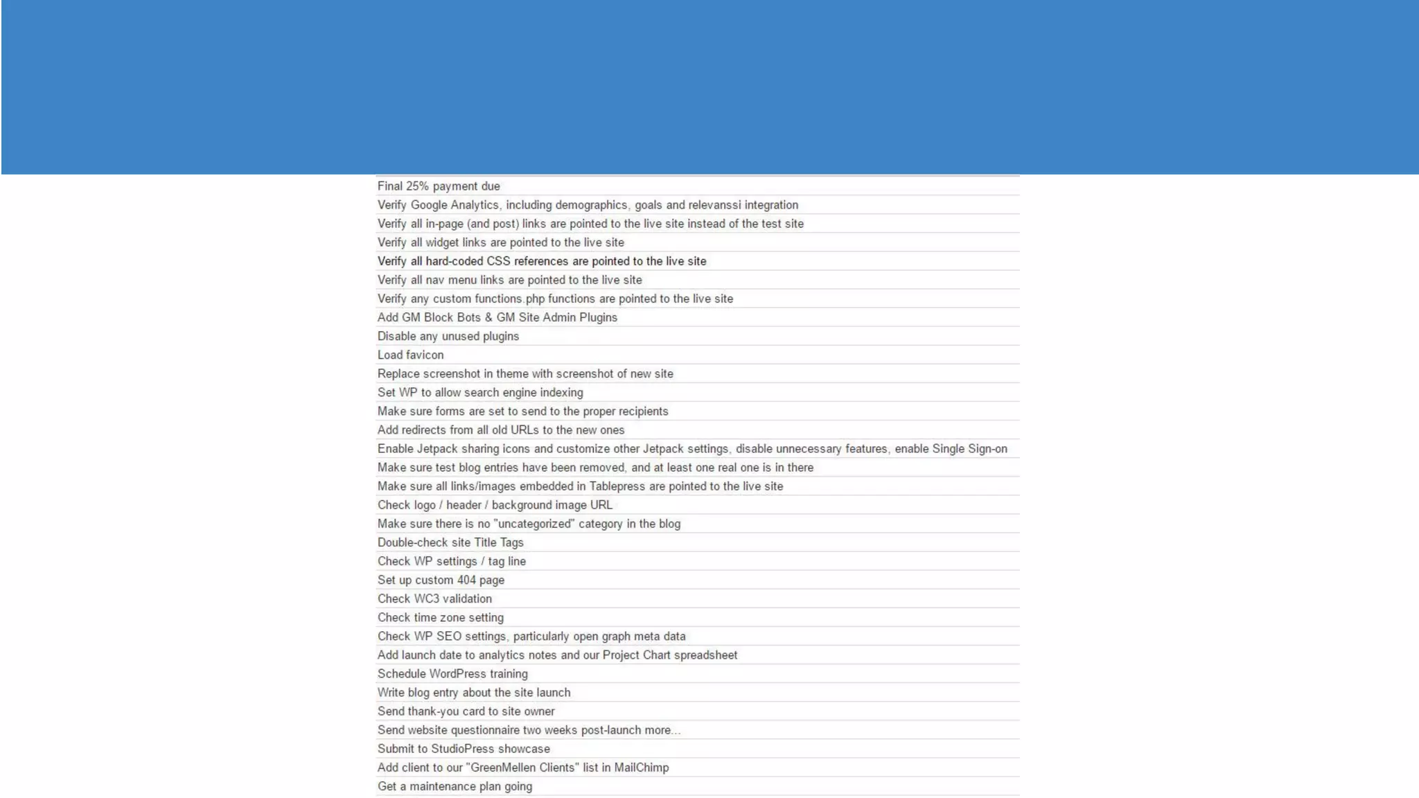 This document provides information about keeping projects smooth from start to finish. It discusses how having a process, using checklists and keeping your inbox clean can help lead to smooth projects. The document also lists tips for each stage of a project including discovery, defining the project, collecting assets, content creation, design, development, training and improvements. It concludes by thanking the sponsor.