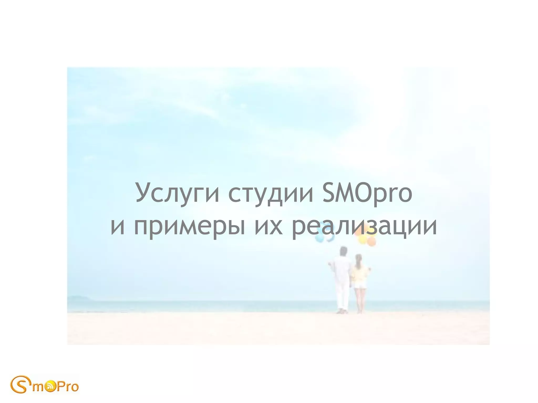 Документ описывает услуги студии smopro по продвижению в социальных сетях, включая Facebook, ВКонтакте, Одноклассники и Twitter, с примерами успешных проектов и количественными показателями участников и откликов. Цены на продвижение варьируются от 23 000 до 55 000 рублей в зависимости от платформы. Студия также предлагает мониторинг отзывов и работу с негативом, обеспечивая оперативное реагирование на проблемы клиентов.