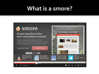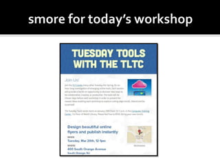 This document provides instructions for using the Smore website and app to create digital flyers and brochures. It outlines how to set up a Smore account by connecting through Facebook, take a tour of example Smores and user profiles, and create a new flyer. It also provides an example workshop flyer that demonstrates how to add a title, description, agenda, and other content, customize the design, save, view analytics, and share the flyer. Users are then instructed to create their own Smore using provided resources or designing their own.