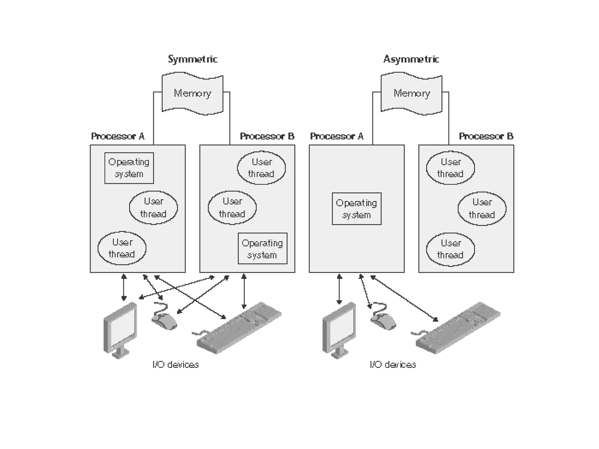 This document discusses symmetric and asymmetric multiprocessor systems. Symmetric multiprocessing involves two or more identical processors that connect to a single shared memory and are controlled by a single operating system instance. An example is a Solaris system that can use multiple processors equally. Asymmetric multiprocessing means processors are not treated equally, such as only allowing one processor to perform I/O. Burroughs B5000/B5500 systems are examples where only one processor could access peripherals. Symmetric multiprocessing provides better load balancing and fault tolerance compared to asymmetric multiprocessing, which is simpler but can fail entirely if the operating system processor fails.