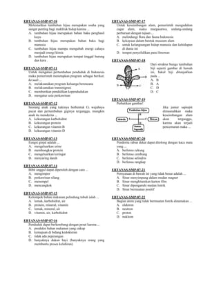 Dokumen ini merupakan evaluasi belajar untuk ilmu pengetahuan alam pada tingkat SMP yang mencakup berbagai topik seperti ekosistem, pernapasan, adaptasi hewan, dan fungsi organ tubuh. Terdapat pertanyaan dan pilihan mengenai berbagai konsep ilmiah, termasuk pengaruh lingkungan, kebersihan, serta adaptasi spesies. Selain itu, ada penekanan pada pentingnya melestarikan lingkungan dan upaya pemerintah dalam program kependudukan.