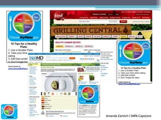 This document discusses strategies for a Digital MyPlate campaign to promote healthy eating habits. It proposes using a multi-pronged social media approach, including engaging the public through an interactive ChooseMyPlate.gov website, social networking platforms like blogs and Twitter, and school-based learning activities. For teens, the campaign would focus on gaming, challenges with friends, and virtual worlds to encourage healthy choices. It would also target "nutritional gatekeepers" like parents through quick tips, recipes, and partnerships to influence family eating habits. The overall goal is to empower people to make healthier diet choices through an educational yet entertaining online experience.