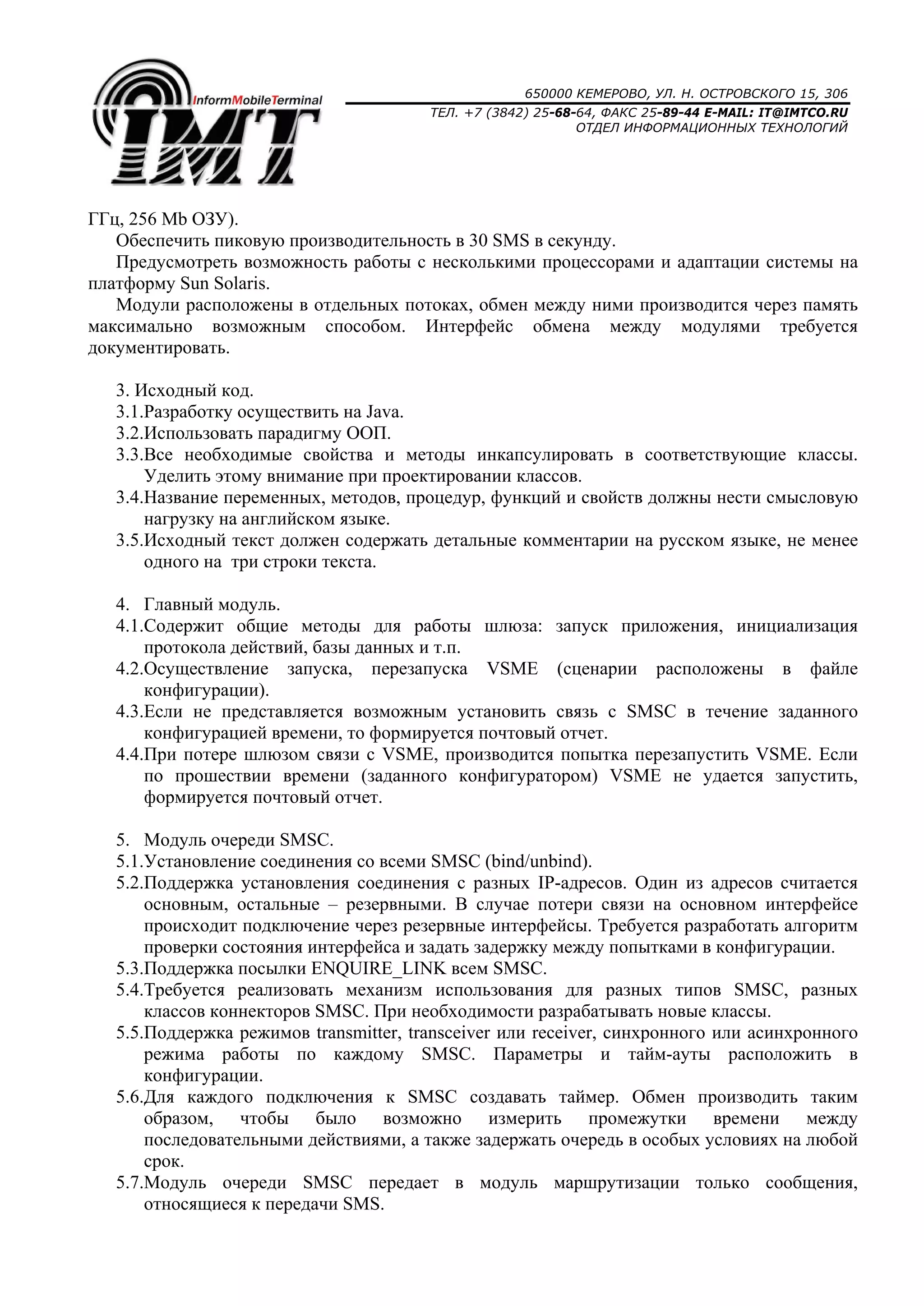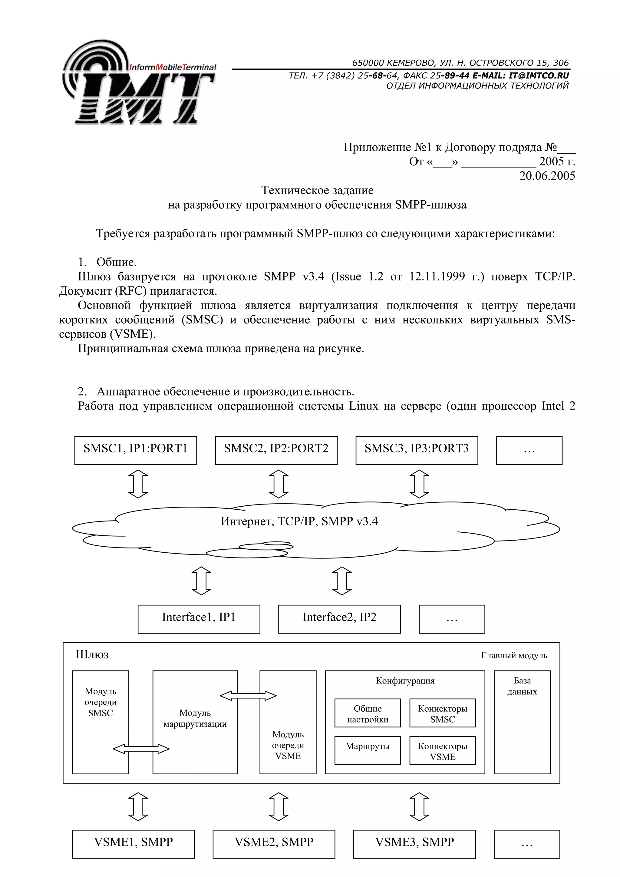 Документ представляет техническое задание на разработку программного обеспечения smpp-шлюза с использованием протокола smpp v3.4 и операционной системы Linux. Шлюз должен обеспечить виртуализацию подключения к SMSC и поддержку нескольких виртуальных SMS-сервисов, включая схемы маршрутизации сообщений и требования к аппаратному обеспечению. Также затрагиваются аспекты разработки, включая использование Java, документацию, систему базы данных и реализацию функциональности управления очередями сообщений.