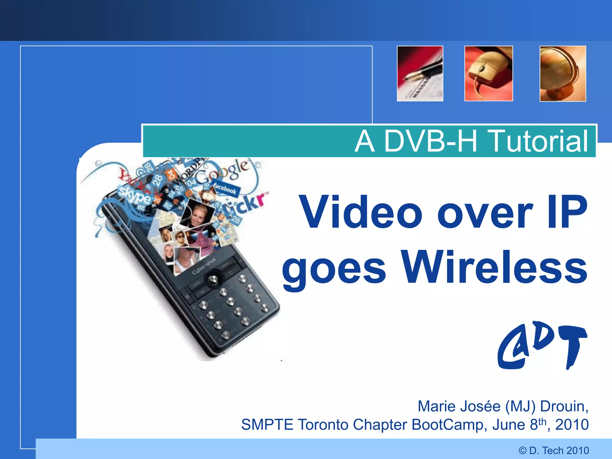 The document provides an overview of DVB-H (Digital Video Broadcasting - Handheld), a standard for delivering digital television and radio services to mobile devices. It discusses key aspects of DVB-H including its basis on DVB-T, use of IP packets, and innovations like time-slicing to reduce power consumption and larger 4K FFT modes to address Doppler effects from mobility. The document also reviews the DVB-H protocol stack and how it solves issues at the physical, data link and network layers for mobile reception.