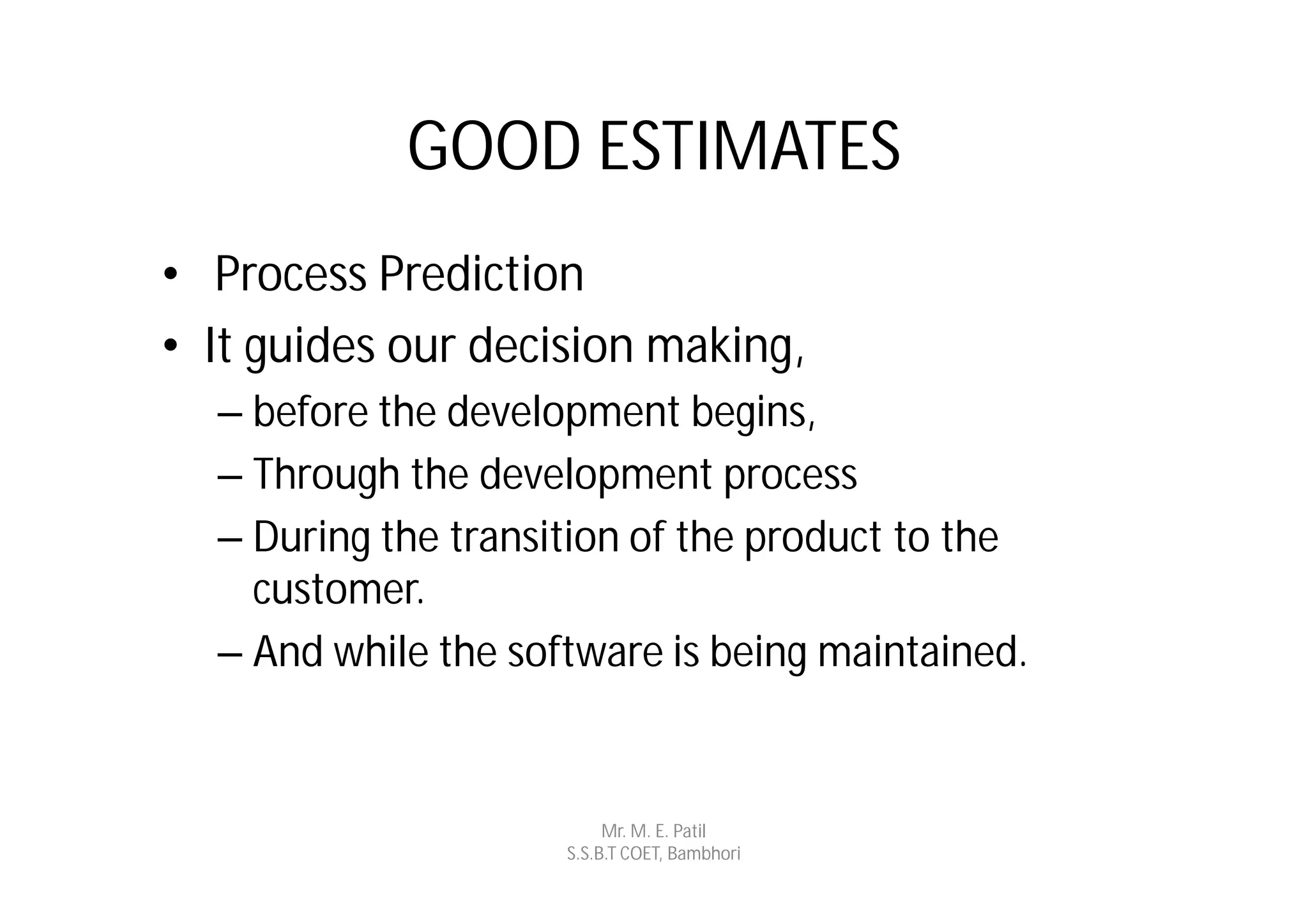 The document discusses various techniques for creating estimates in software development projects, including prediction, estimation ranges, and accuracy evaluation. It covers common estimation models like COCOMO and SLIM that relate project size to effort using mathematical formulas and adjustment factors. The goal of estimates is to provide reasonably accurate predictions to guide project planning and decision making.