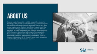 Strategic Market Research is a research firm located in Jamshedpur that provides customized reports, data mining, and consulting services across various industries. Their team of analysts helps clients plan strategic moves using primary and secondary research methods like interviews, surveys, and statistical analysis. The company ensures accurate results through a rigorous research process involving data collection, analysis, validation, and conclusions from subject matter experts.