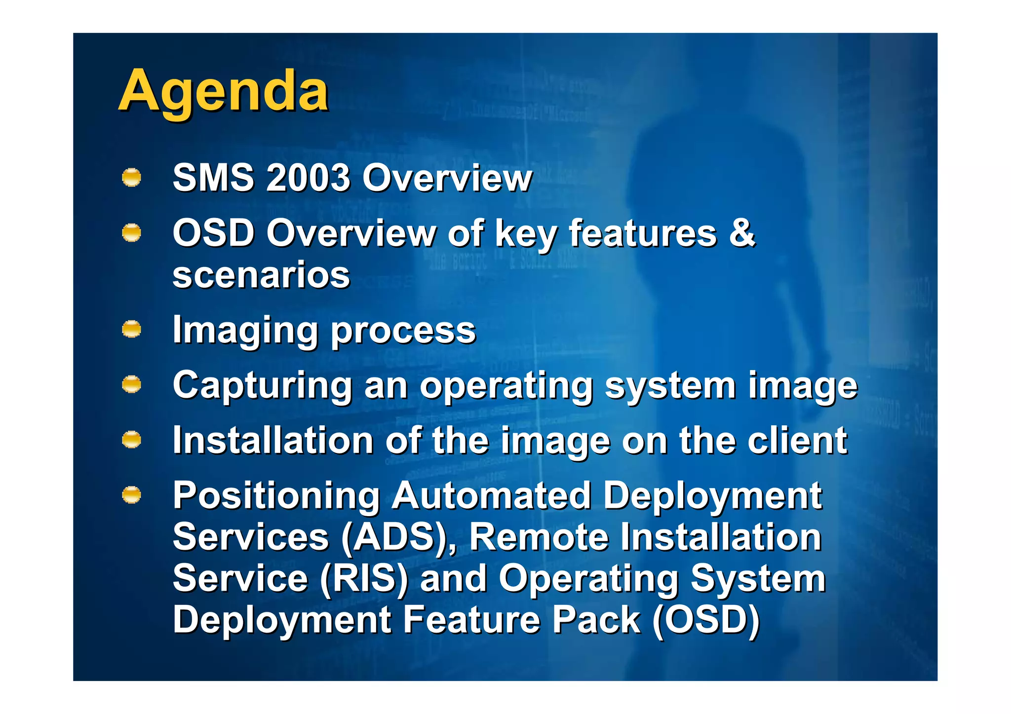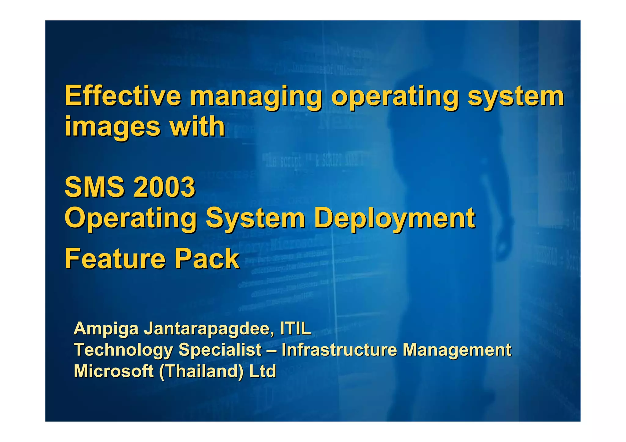 The document provides an overview of managing operating system images using SMS 2003 and its Operating System Deployment Feature Pack. It discusses capturing operating system images, creating image packages, deploying images to target computers, and comparing SMS 2003's Automated Deployment Services, Remote Installation Services, and Operating System Deployment features. Key points covered include imaging formats, deployment scenarios, client requirements, and log files for troubleshooting deployments.