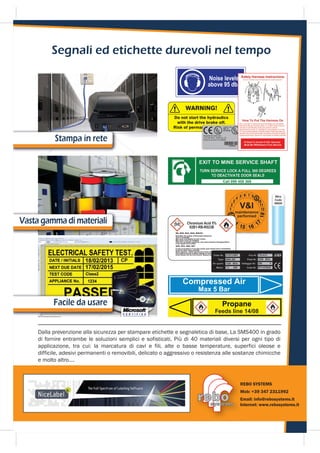 La SMS 400 è un sistema industriale per la stampa di etichette con risoluzione di 300 dpi, adatto a una vasta gamma di materiali e applicazioni. È dotato di software Nicelabel e può produrre etichette di dimensioni variabili, rendendolo ideale per dettagli di piccole dimensioni. Inoltre, offre soluzioni per le esigenze di marcatura, manutenzione e sicurezza.