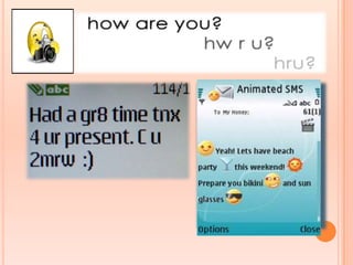 This document provides a discourse analysis of SMS language as a novel genre. It discusses how SMS language has revolutionized everyday communication through abbreviations and other features. The analysis examines SMS language through frameworks like Grice's cooperative principle and maxims, code-switching, psychoanalysis, and critical discourse analysis. It argues that SMS language represents a new hybrid genre that blends speech and writing to meet the constraints of text messaging while serving social functions.