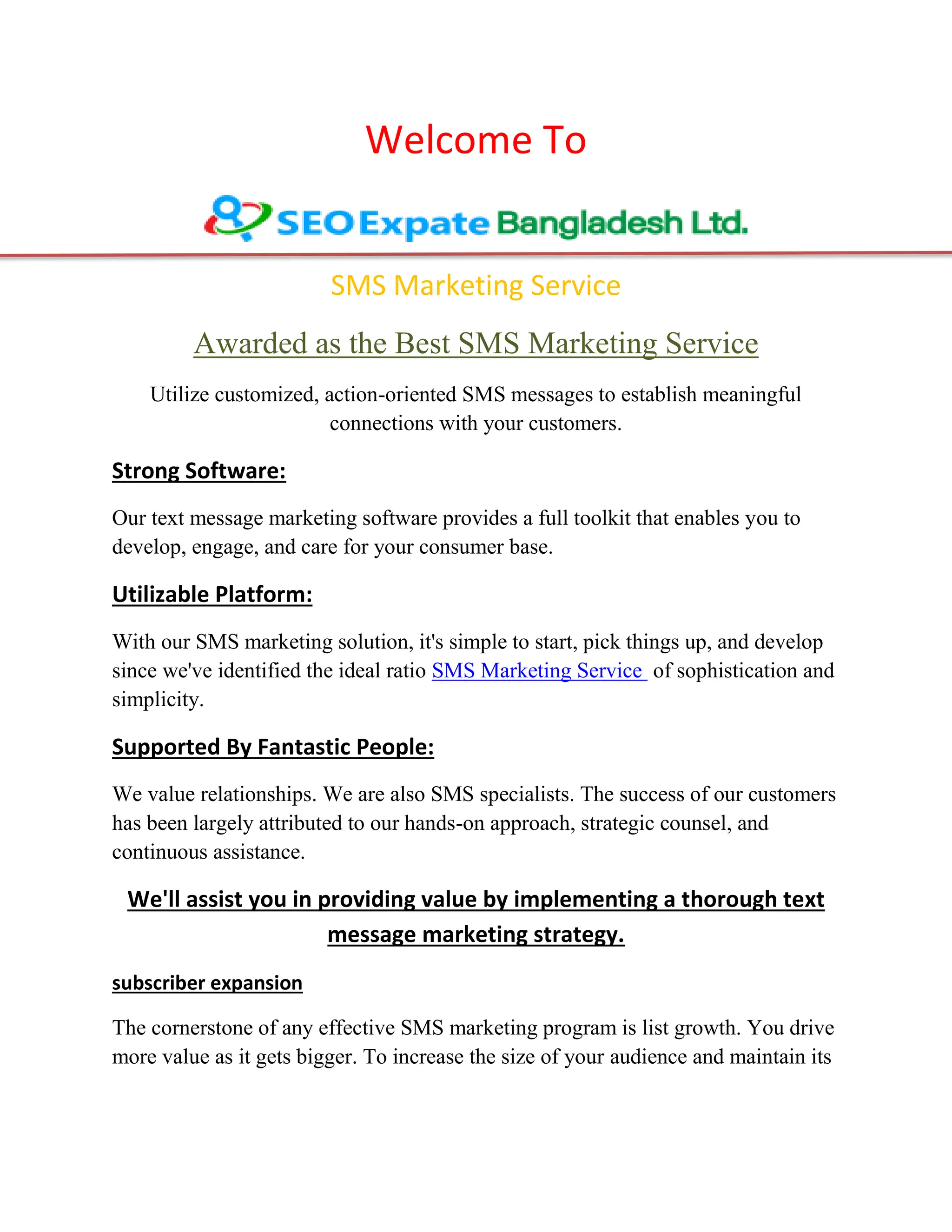 The document presents an SMS marketing service recognized for its effective customer engagement and customizable messaging solutions. It highlights tools for subscriber growth, personalized messaging, and automated workflows to enhance marketing strategies. Additionally, it underscores a dedicated support team and positive customer feedback, emphasizing the platform's user-friendliness and integration capabilities.