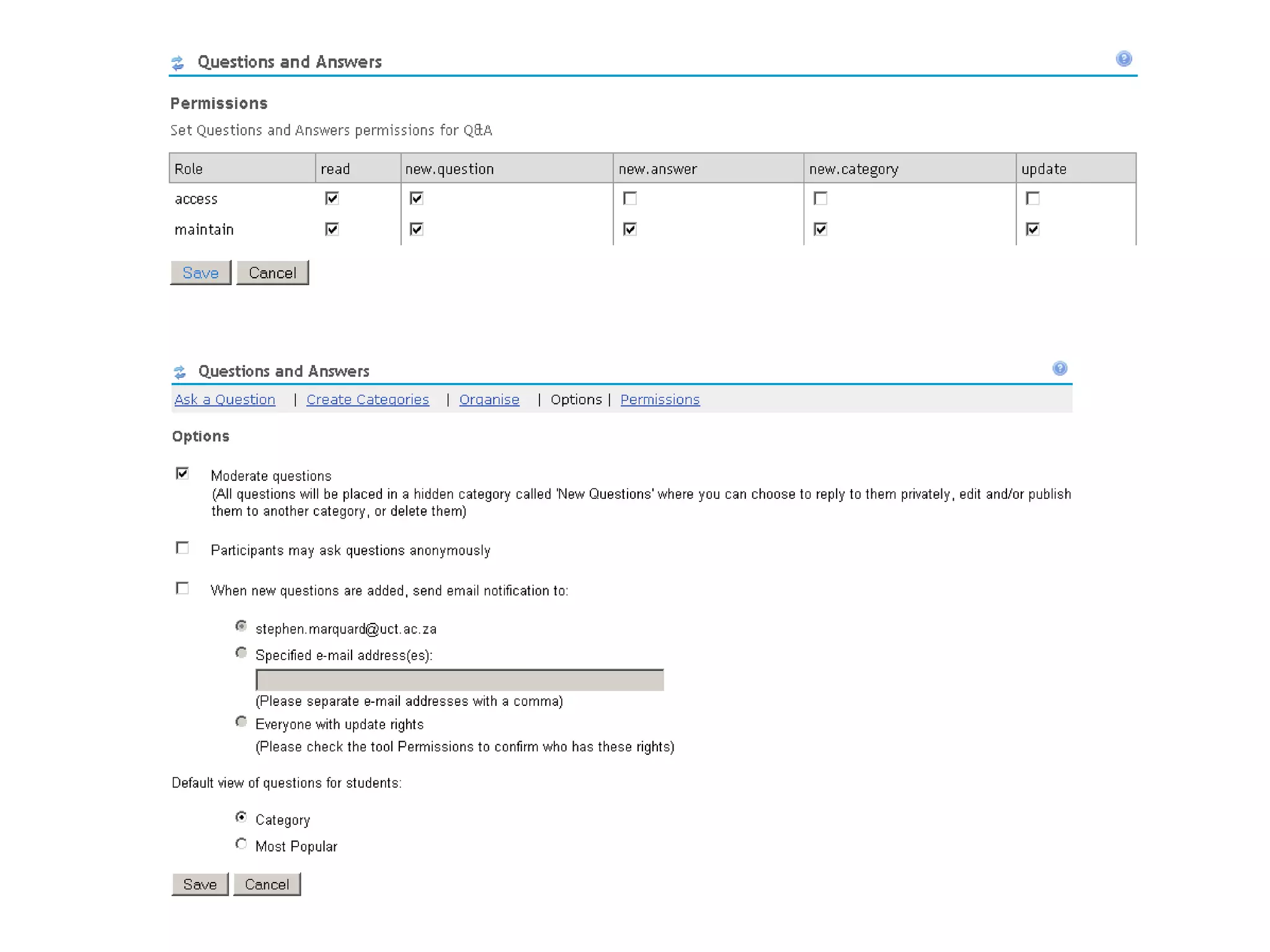 SMS allows sending text messages to groups of people from within Sakai. Q&A is a question and answer tool that supports question-driven interaction through web, email, and SMS. Course Evaluations is an online tool for delivering course evaluations and surveys.