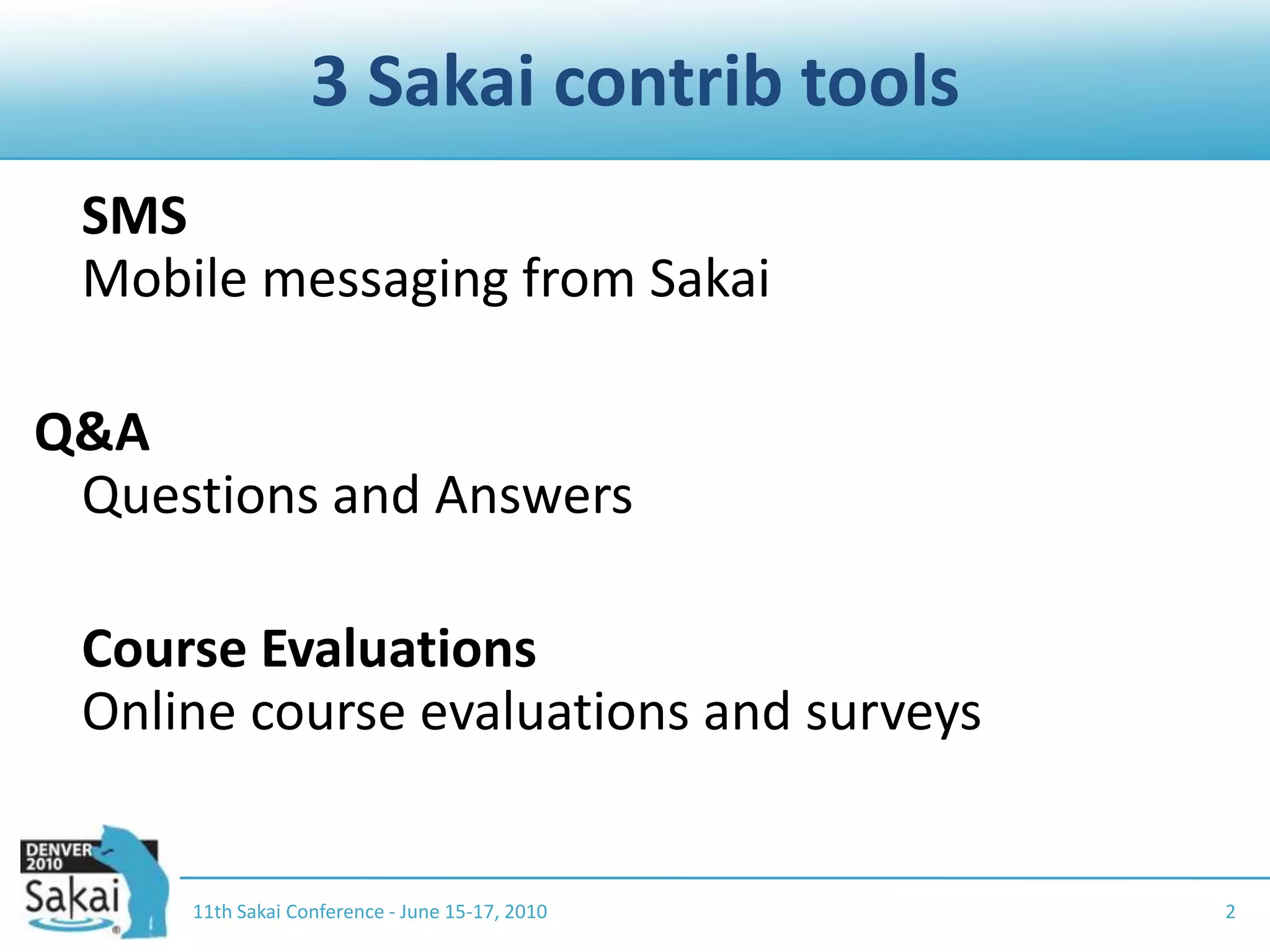 The document summarizes three Sakai contrib tools: SMS, Q&A, and Course Evaluations.