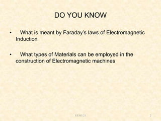 This document discusses three-phase induction motors. It describes their advantages over other motors, including being very simple, rugged, reliable, and low cost. It then discusses the construction of three-phase induction motors. The construction includes a stationary stator and a rotating rotor. The stator contains windings that produce a rotating magnetic field. The document describes two types of rotors: squirrel cage and wound (slip ring). Squirrel cage rotors are the most common due to their simple and rugged design. Wound rotors allow adding resistance to the rotor circuit for starting.