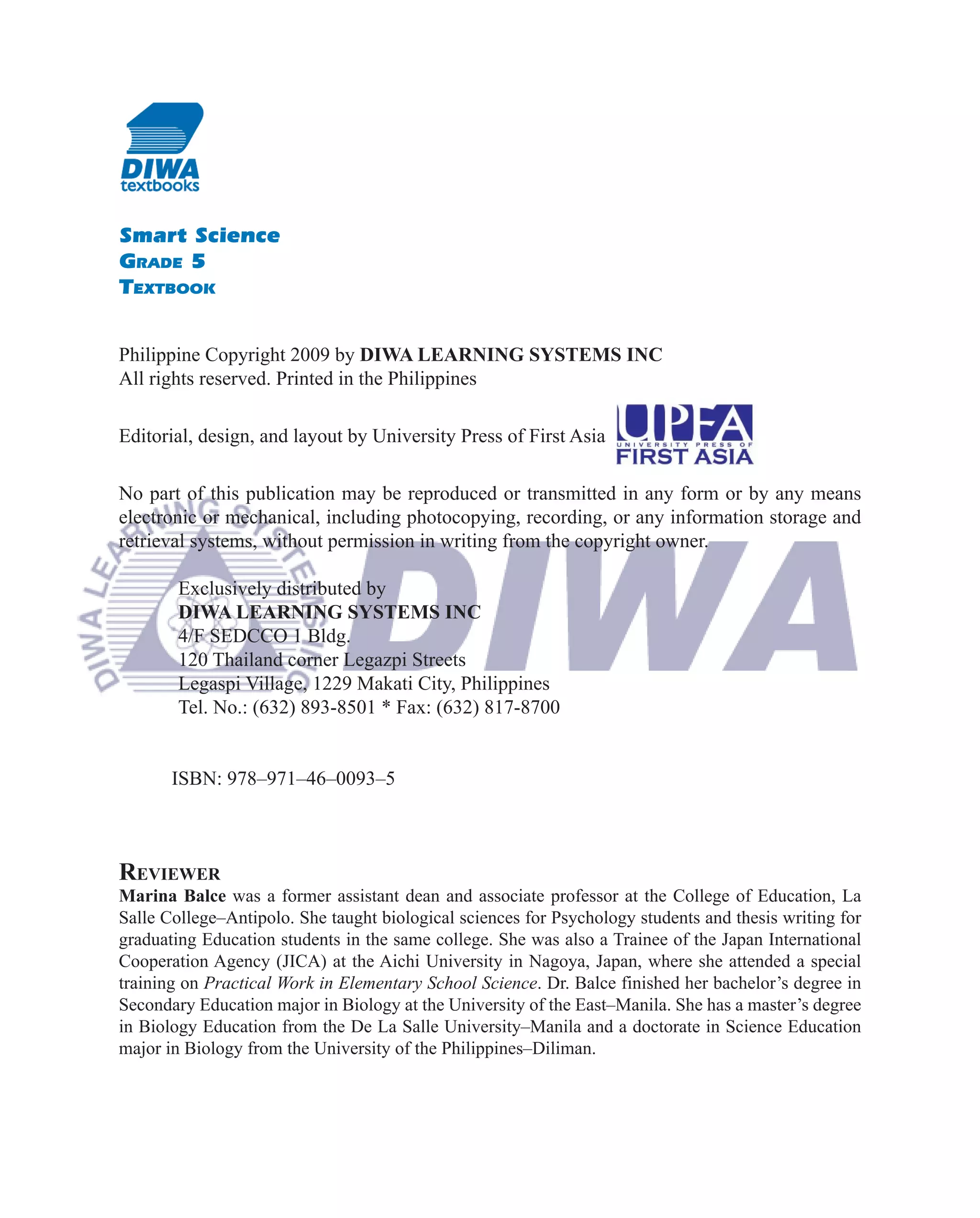 This document appears to be the table of contents for a 5th grade science textbook titled "Smart Science" published in the Philippines in 2009. The textbook covers topics like the human body systems, plants and animals, matter and energy, machines, and earth science. It is reviewed by Dr. Marina Balce, a former professor and biology education specialist.