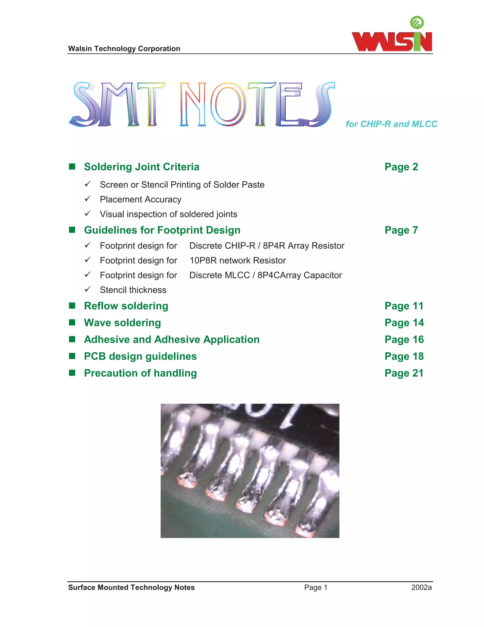 The document provides guidelines for surface mount technology including soldering joint criteria, footprint design, reflow soldering, wave soldering, and PCB design. It outlines criteria for screen printing of solder paste, placement accuracy, and visual inspection of soldered joints. Footprint dimensions and design guidelines are provided for discrete chip resistors, array resistors, network resistors, and multilayer ceramic capacitors for different component sizes. Placement accuracy requirements are also specified.