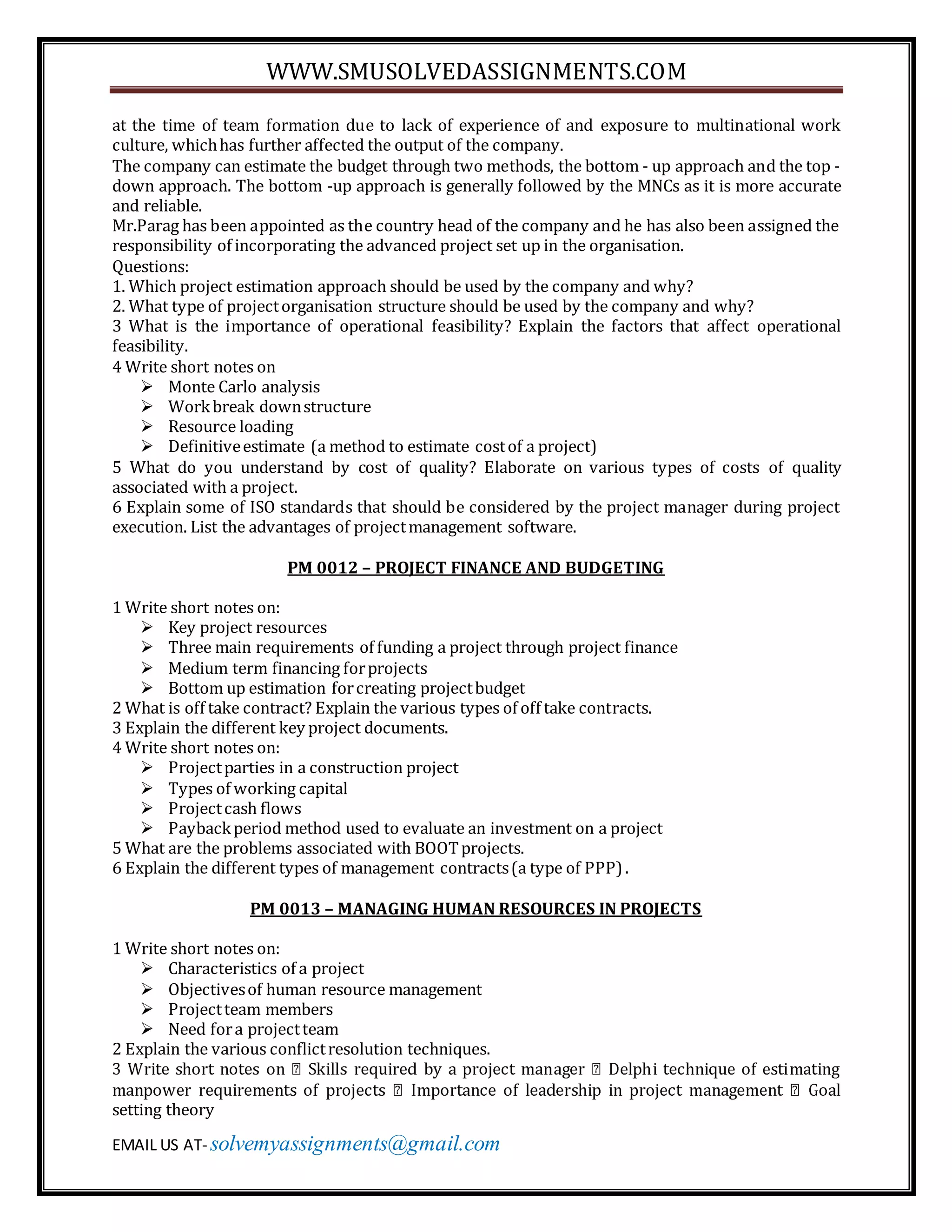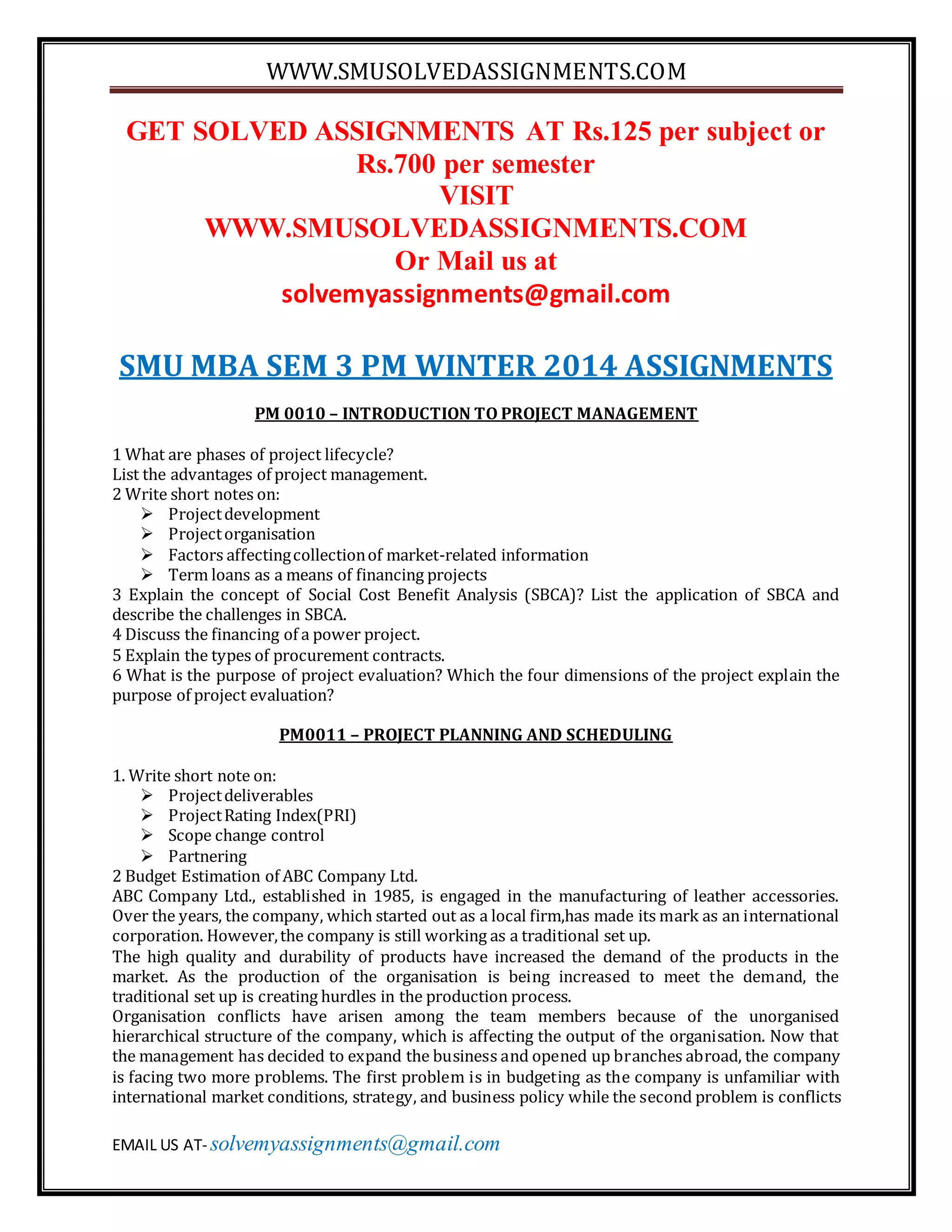 The document outlines various assignments related to project management, planning, finance, and human resource management for an MBA program. It includes specific questions and topics for each assignment, such as project lifecycle phases, budgeting methods, and conflict resolution techniques. Additionally, it promotes a service for providing solved assignments at competitive rates.