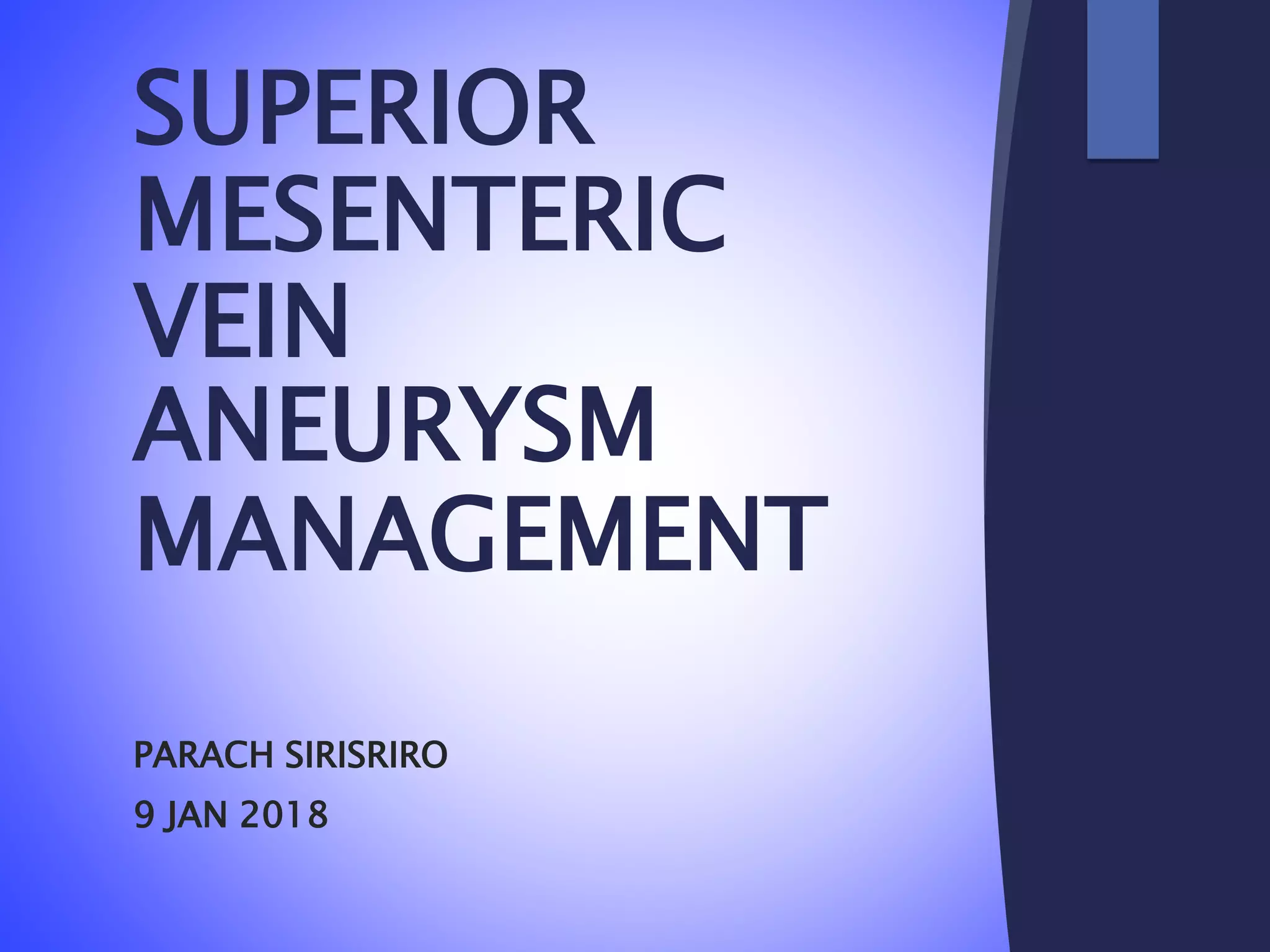 This document describes the case of a 74-year-old Thai female with a known superior mesenteric vein (SMV) aneurysm. She presented with abdominal discomfort for one month. On examination, her abdomen was moderately distended with mild tenderness in the suprapubic region. The document then reviews definitions, etiology, clinical presentation, complications, and management approaches for SMV aneurysms. It discusses that surgical intervention is usually indicated for symptomatic or expanding aneurysms. Options include aneurysmorrhaphy or aneurysmectomy. For this patient, proper management would involve surgical resection of the aneurysm.