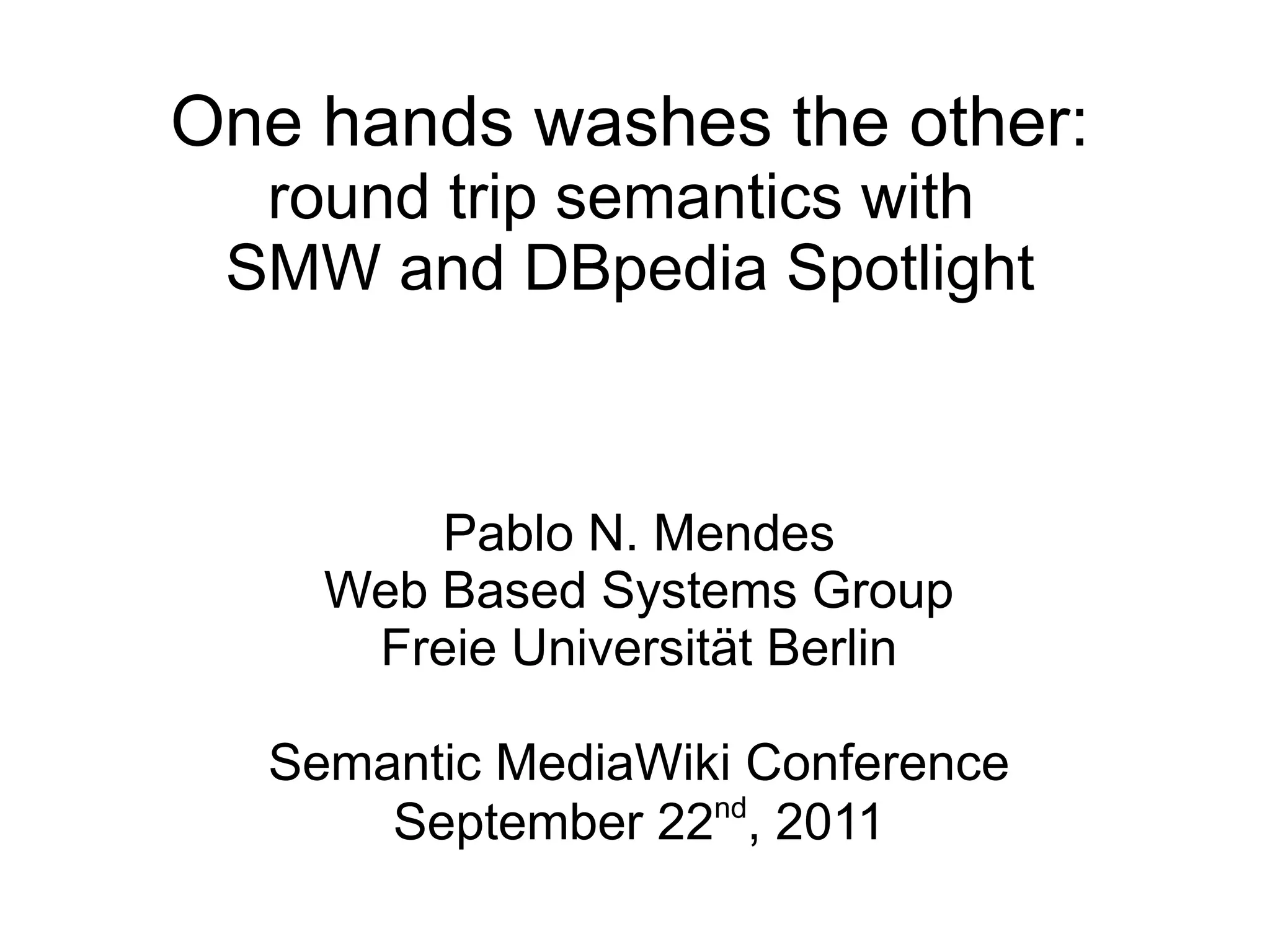 The document discusses how Semantic MediaWiki (SMW) and DBpedia Spotlight can work together to improve linking, disambiguation, and redirection of terms on Wikipedia pages. DBpedia Spotlight can suggest targets for links as a user types and provide "see also" links, helping to create better links, disambiguation pages, and redirects. This round-trip relationship between SMW and DBpedia Spotlight can help build a better web of linked data.