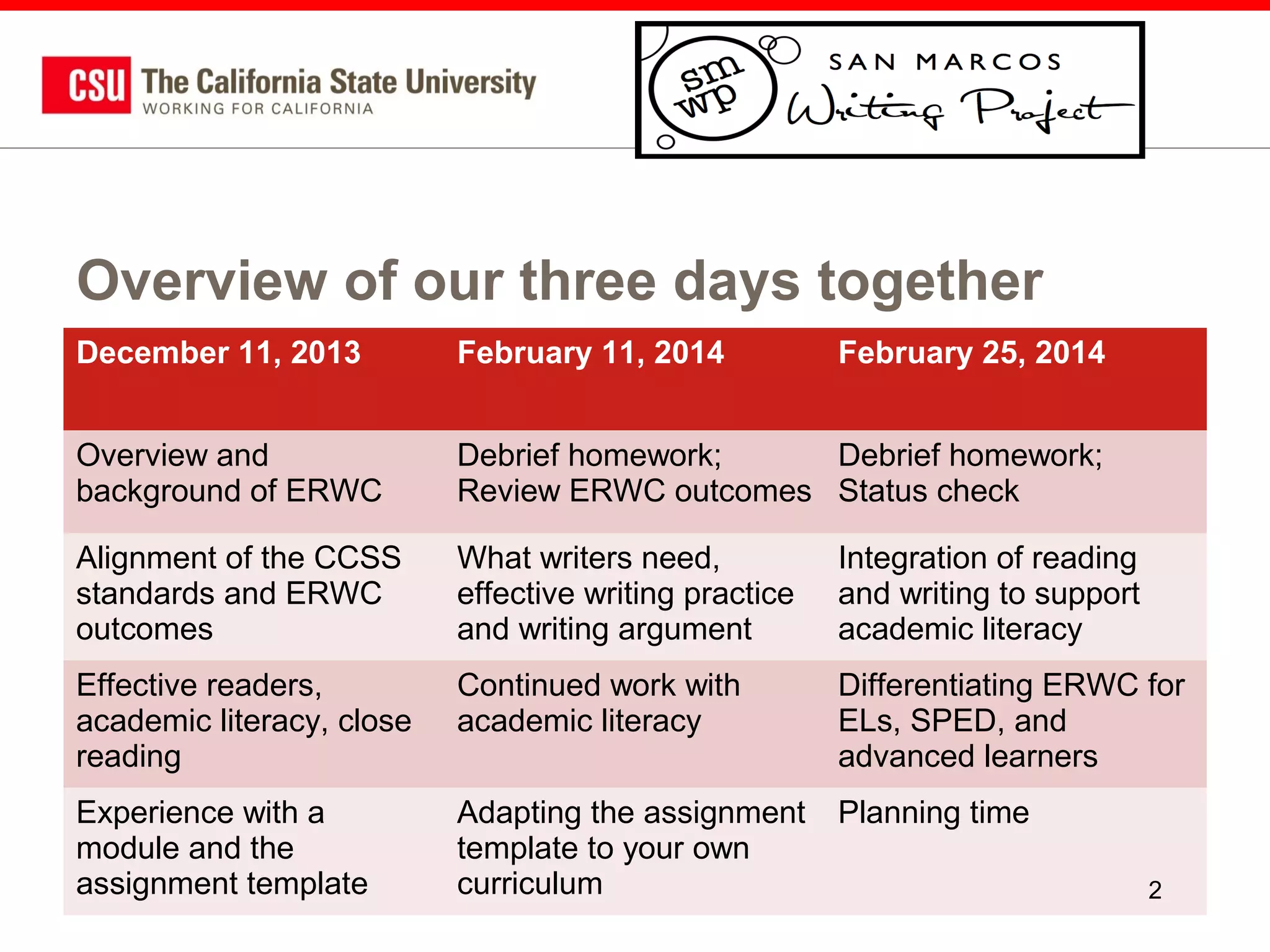 The document provides an agenda for a three-day middle school professional learning event on expository reading and writing. Day 1 will cover an overview of the Expository Reading and Writing Course (ERWC) outcomes and how they align with Common Core State Standards. It will also discuss differentiating instruction for English learners, special education students, and advanced learners. Day 2 will debrief homework assignments, discuss what writers need for effective writing practice, teach about argument writing, academic literacy and close reading, and examine an 8th grade module on social networking. Day 3 will continue working on academic literacy and adapting assignment templates to individual curriculums.