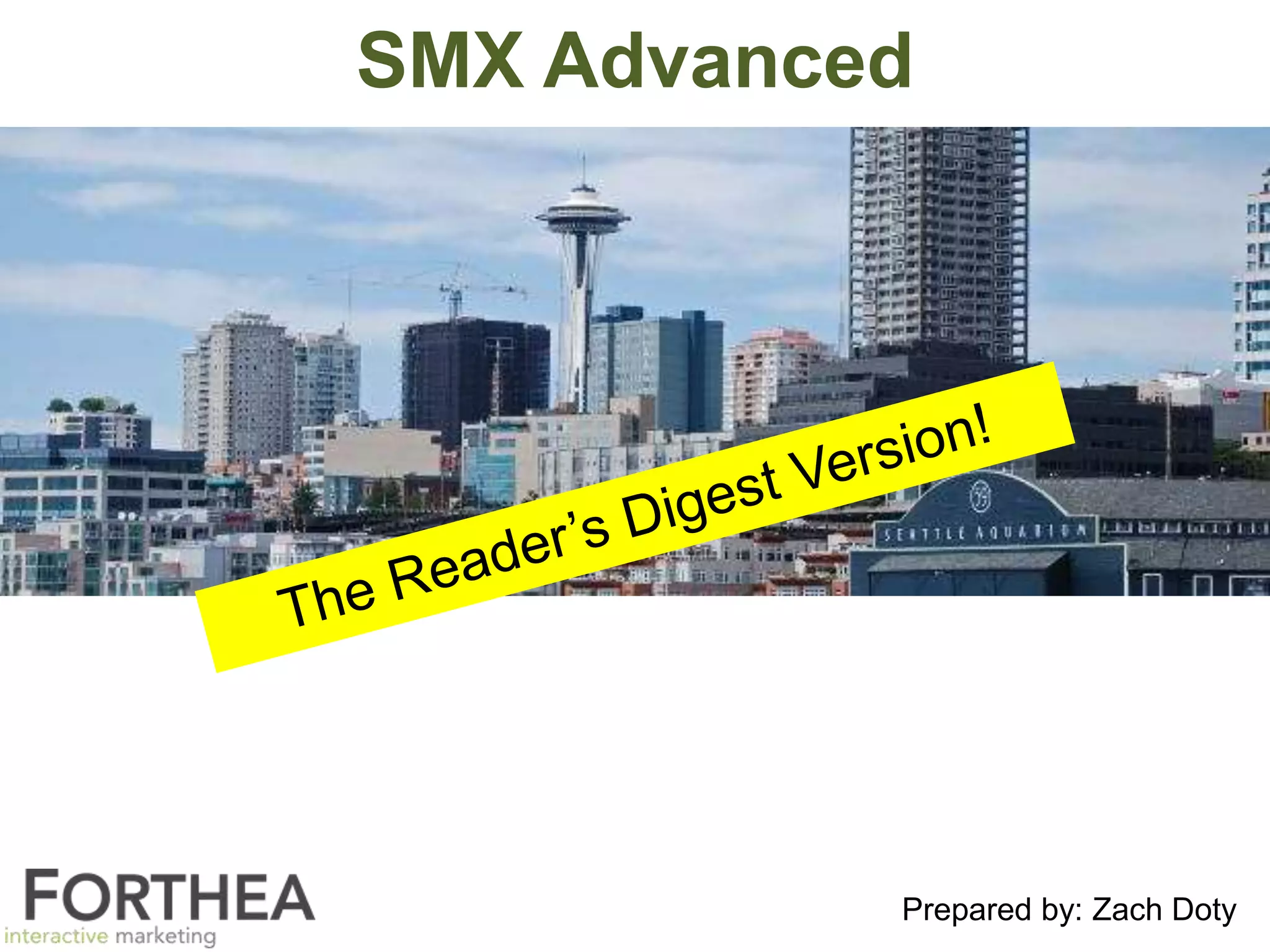 The document outlines insights from a presentation by Zach Doty at the SMX Advanced conference, emphasizing the importance of professional development in digital marketing. Key topics discussed include advancements in SEO, new success metrics for measuring performance, and the necessity of adapting to changing user experiences and technologies. The presentation advocates for strategic budget management and continuous website testing to keep pace with competitive landscapes.