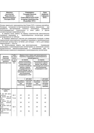 Документ содержит нормы отвода земель для магистральных водоводов и канализационных коллекторов, утвержденные в 1973 году государственным комитетом совета министров СССР. Нормы регламентируют размеры полос и участков для временного и постоянного использования, а также согласования с другими ведомствами. Включены таблицы ширины полос земель в зависимости от диаметра труб и глубины заложения.