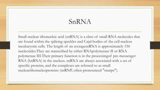 Small nuclear ribonucleic acid (snRNA) is a class of small RNA molecules involved in splicing pre-messenger RNA in eukaryotic cells. SnRNAs, categorized into sm-class and lsm-class, work with specific proteins to form small nuclear ribonucleoproteins (snRNPs) that are crucial for the spliceosome complex responsible for RNA maturation. The spliceosome, composed of snRNAs and numerous proteins, facilitates the removal of introns and ligates exons to create mature mRNA.