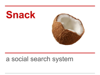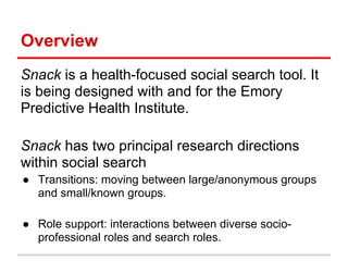 Snack is a health-focused social search tool developed for the Emory Predictive Health Institute, designed to facilitate interactions between healthcare advisors and clients. It includes features like a web app and browser extension for managing health information, messaging, and search challenges, with two primary user roles: advisors and clients. The platform aims to enhance health resource collection, client guidance, and social connectivity through curated information and collaborative searching.