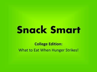 This document provides college students with guidance on healthy snacking options. It recommends that a good snack should contain around 200 calories, less than 12g of fat, and a balance of complex carbs and protein. Some on-the-go snack ideas mentioned include string cheese, yogurt, apples, and trail mix. Homemade snack suggestions incorporate ingredients like popcorn, oats, eggs, and whole-grain pasta. The document also discusses factors like hunger cues, calorie needs based on activity levels, and tips for improvising snacks in a dorm kitchen.