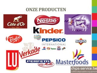 This document lists snack and candy bar products available from Chips-Service including granola bars, candy bars, sweets such as chocolate bars, and savory snacks. More information can be found on their website at www.chips-service.be.
