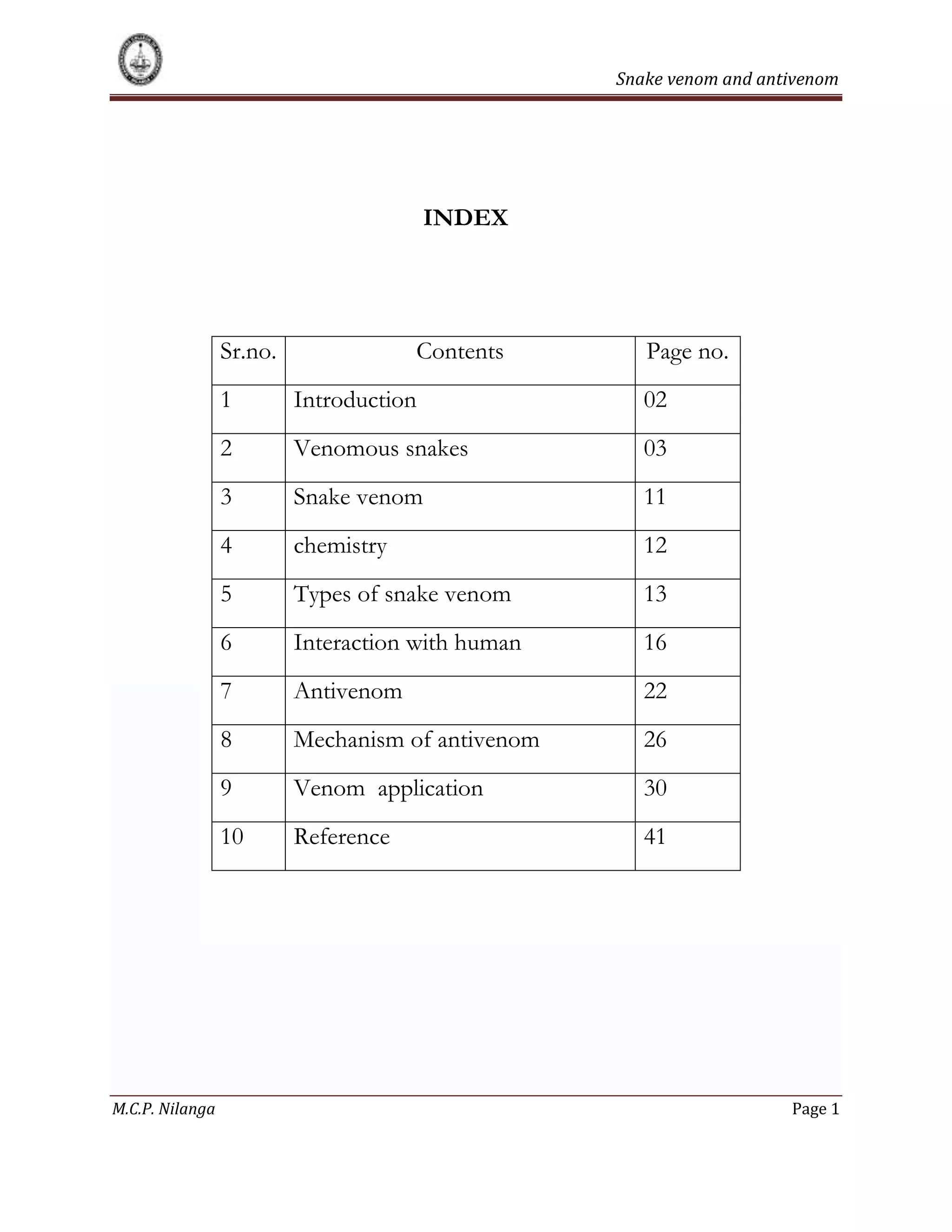 The document summarizes information about four species of venomous snakes found in India - the Indian cobra, common krait, Russell's viper, and saw-scaled viper. It describes their physical characteristics, venom composition and effects, habitat, and role in causing snakebites in India. Together these four snakes are responsible for the majority of snakebite deaths in the country.