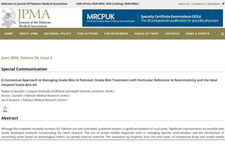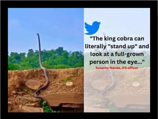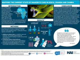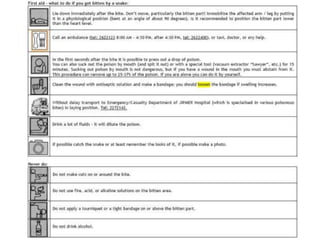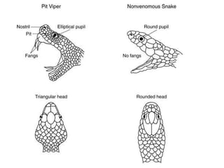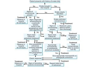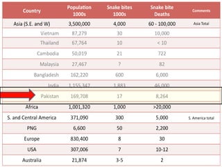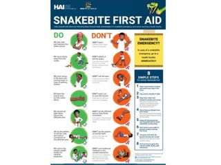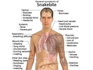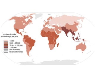 This document discusses the significance of snakebites, primarily affecting poorer rural populations with limited access to healthcare, leading to underestimated mortality and economic impact. It details the biological characteristics of snakes, types of venom, symptoms of envenomation, and treatment approaches, emphasizing the importance of antivenom administration. Additionally, it highlights prevention measures and the need for public education regarding snakebite first aid.