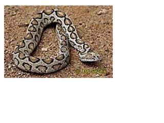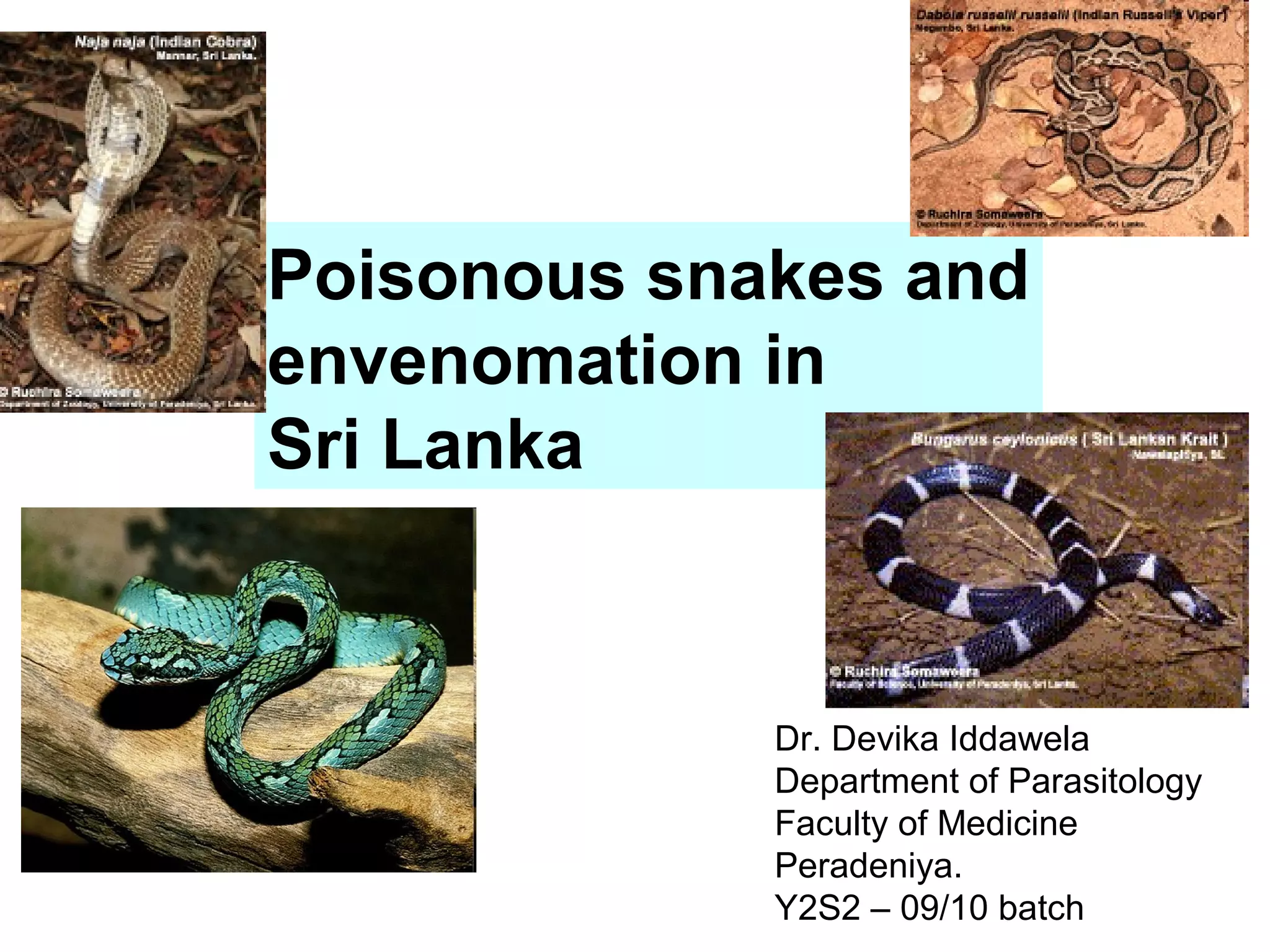 This document discusses poisonous snakes and snake envenomation in Sri Lanka. It begins by classifying snakes as either poisonous or non-poisonous. The six highly poisonous snakes in Sri Lanka are identified as the Common Krait, Ceylon Cobra, Russell's Viper, Saw-scaled Viper, Green Pit Viper, and Hump-nosed Viper. These snakes are categorized based on their venom composition and the systemic effects of their bites. First aid procedures and hospital treatment protocols for snake bites are outlined. Prevention methods like wearing protective footwear and being cautious of where one steps are recommended to avoid encounters with snakes.