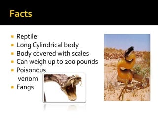 The document discusses various aspects of snakes, including their physical characteristics, habitats, and ecological roles. It highlights their diversity, venom potency, and the threats they face due to habitat destruction, climate change, and human ignorance. Additionally, it emphasizes the importance of conservation efforts to protect these misunderstood creatures.