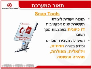 #5 סט כלים חדשניים להעברת מסרים וקמפיינים פנימיים : תקשורת של buttom-up בהשתתפות העובדים The Snap Tools, push communications out to staff….. At times that suit their work flow / they are more receptive All tools have click-through link capability All are able to targeted to different groups of staff, partner etc Generally the communications are displayed on their computer screens but can also be targeted to flat screen displays such as plasmas or kiosks for off-line workers. Staff do not have to be online to receive communications which will display at pre specified times even while offline - a great tool to stay in touch staff who are in the field.