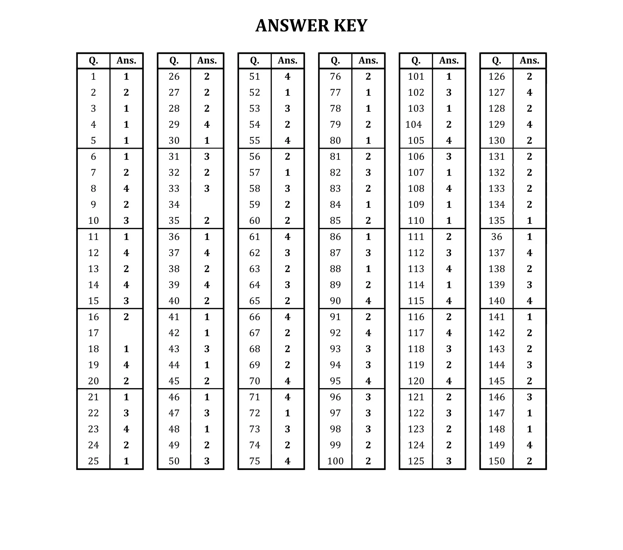 This document contains an answer key with questions numbered 1-150 in the left column and corresponding answers in the right column. It appears to be from a test or exam.