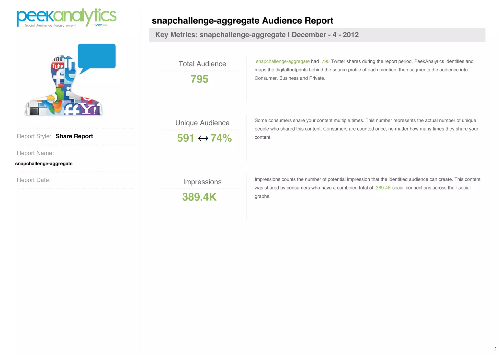 snapchallenge-aggregate had 795 Twitter shares during the report period, reaching a unique audience of 591 people. This content was shared 389,400 times potentially reaching 393,948 indirect impressions. The average age of female followers was 36-45 while males tended to be 46-55. Geographically, followers were most prominent in Philadelphia, PA and New Jersey, USA. Top interests were movies, food, and education.