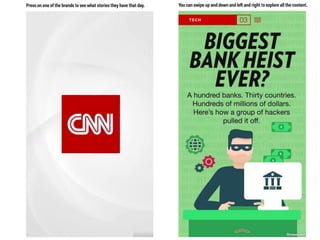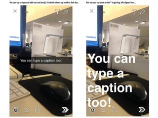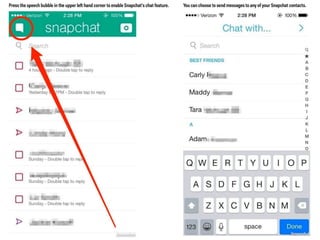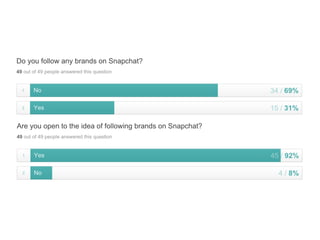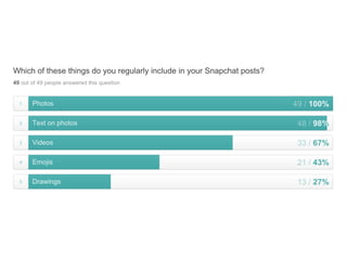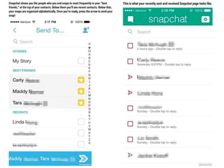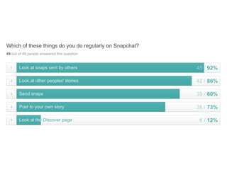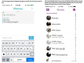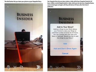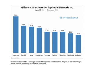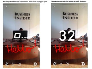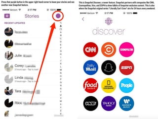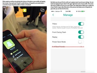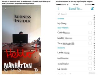 This document discusses the significance and usage of Snapchat, particularly in the context of college students and media organizations. It highlights the unique features of the platform and provides insights from various institutions, including Drake University and NPR, about their experiences using Snapchat for storytelling and engaging audiences. Additionally, it shares tips for effective content creation on Snapchat and the platform's appeal to young users.