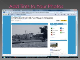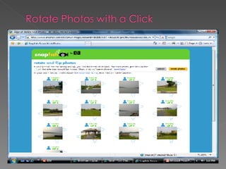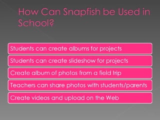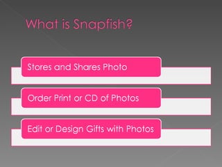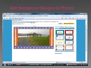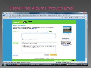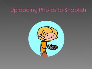 The document provides 7 steps for uploading photos to an online photo album service: 1) fill out a registration form and click "Go Fish", 2) visit your account page, 3) click "Upload Photos", 4) give the album a title, date, and description, 5) click "Select photos & video" to choose files, 6) select files from your computer to upload, 7) uploaded photos can then be edited, shared, or used to create prints or gifts.