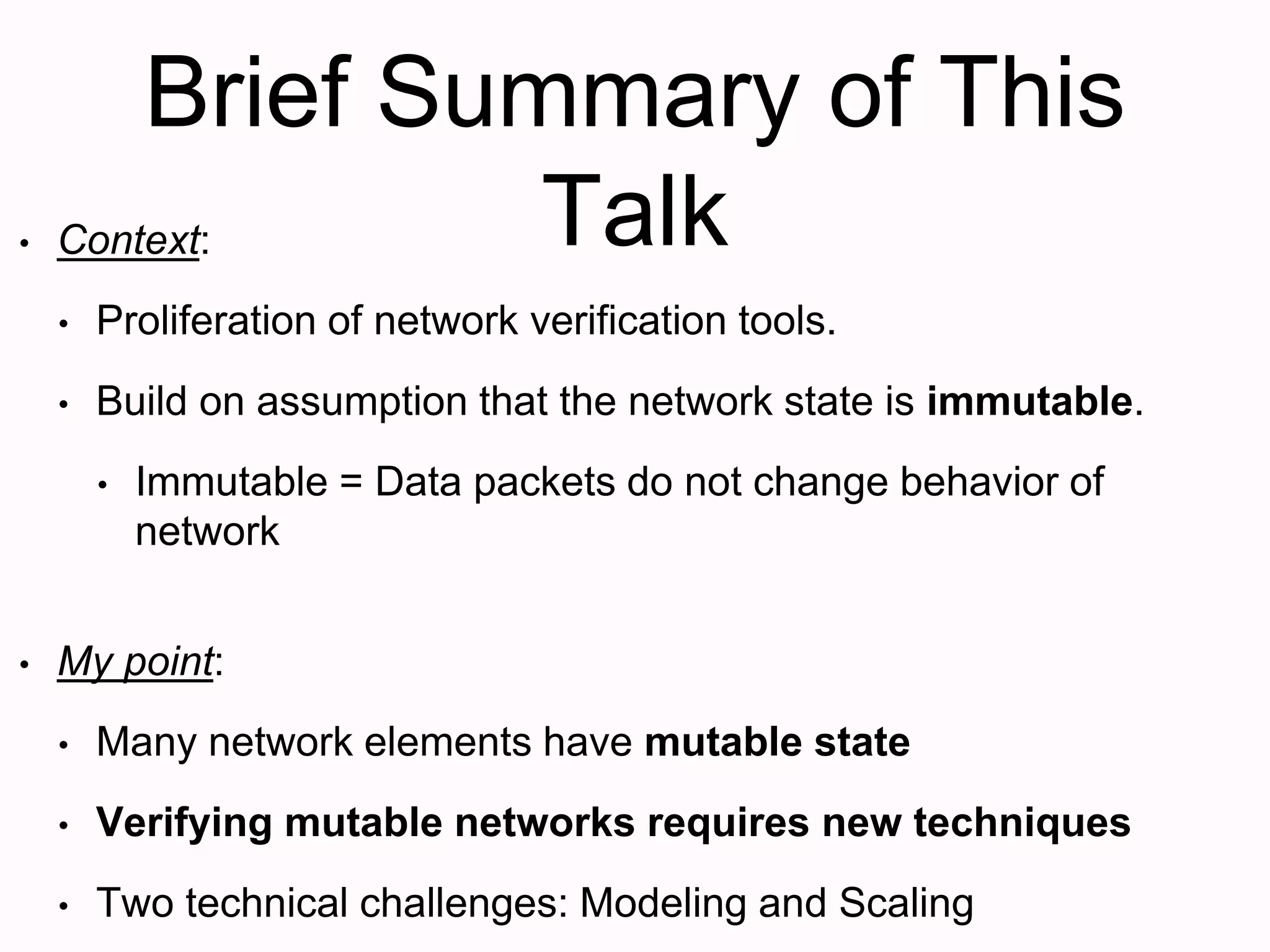New techniques are needed to verify networks that contain mutable middleboxes with evolving state. Modeling the behavior and data dependencies of middleboxes is challenging but important to capture their functionality. A scalable approach is to leverage the flow-parallel nature of middleboxes and use compositional verification to check connectivity properties between pairs of hosts by only analyzing the path between them. Specifying middleboxes at the right level of abstraction is also key to make verification tractable.