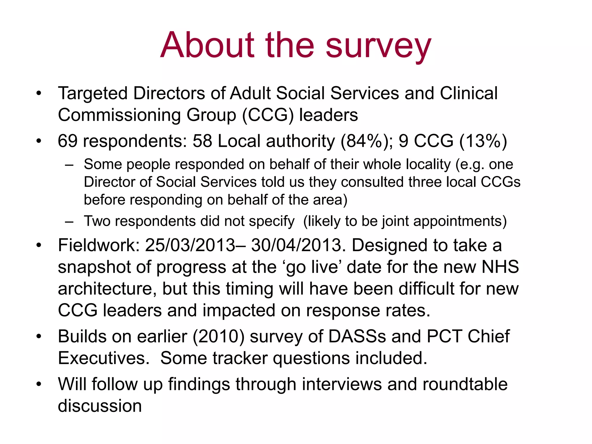 Local leaders report that integrated care can provide benefits like reduced hospital delays and admissions as well as improved patient experiences. Factors helping integration include leadership commitment, joint planning, and collaborative working between organizations. Hindrances include different data/IT systems, organizational complexity, and cultural differences. To accelerate integration, leaders emphasize sharing good practices, addressing financial barriers, and providing practical IT solutions rather than more central guidance. While reform disrupted some joint working, leaders remain optimistic about continuing integration under the new structures. Population-focused initiatives, multidisciplinary teams, and shared values are seen as most effective for patients. Efforts prioritize older adults, those with learning disabilities, and mental health patients. Aspirations for 2015 include further developing pooled budgets