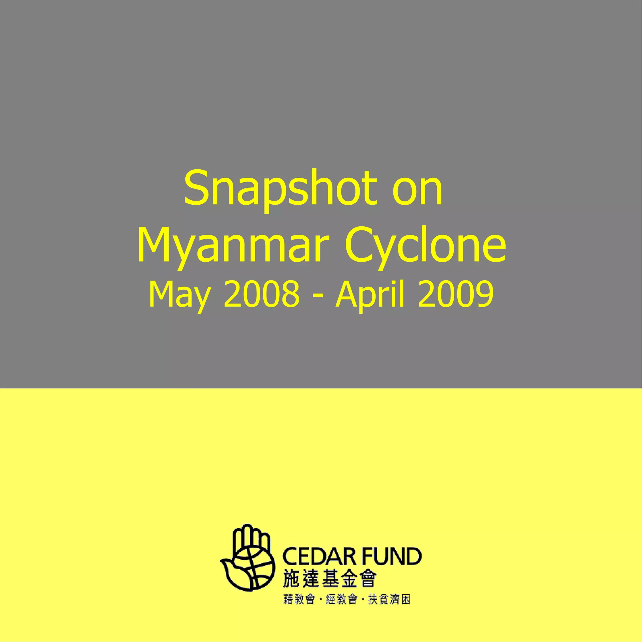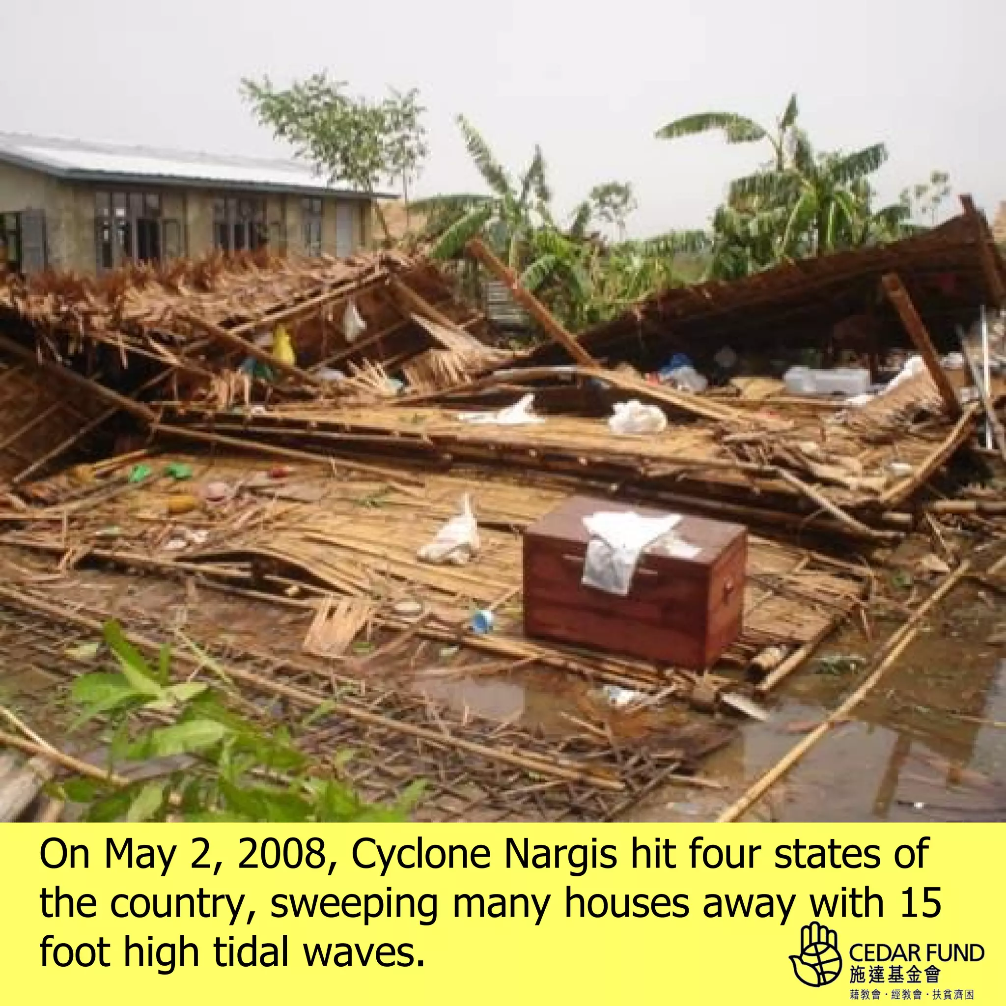 Cyclone Nargis hit Myanmar in May 2008, killing over 140,000 people and leaving many survivors homeless and without resources. Christian Emergency and Development Aid Relief (CEDAR) provided emergency relief to remote villages, including temporary shelter, food, cooking supplies, and materials to rebuild homes. Medical assistance was also given to survivors in temporary camps. CEDAR continues to support rebuilding efforts through distribution of fishing nets, farm supplies, rebuilt water systems, and trauma counseling to help communities recover.