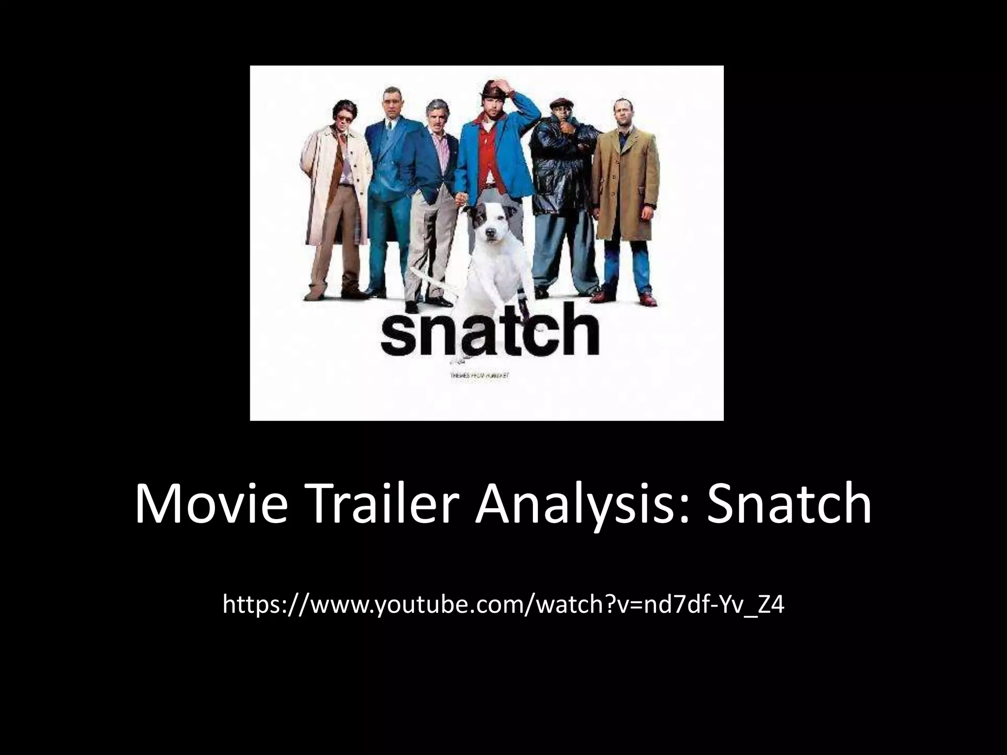 The trailer for the 2000 crime comedy film Snatch introduces the main characters and intertwining plots involving underground boxing and an confrontation with arms dealers. Through close-up shots of diamonds, boxing action, weapons, and jewelry, the trailer establishes the criminal underworld setting and genres of crime and action. It also uses humorous dialogue to appeal to audiences. The editing employs fast-paced transitions between shots to bombard viewers with information in an exhilarating way and keep their attention, with the goal of encouraging audiences to watch the full film.